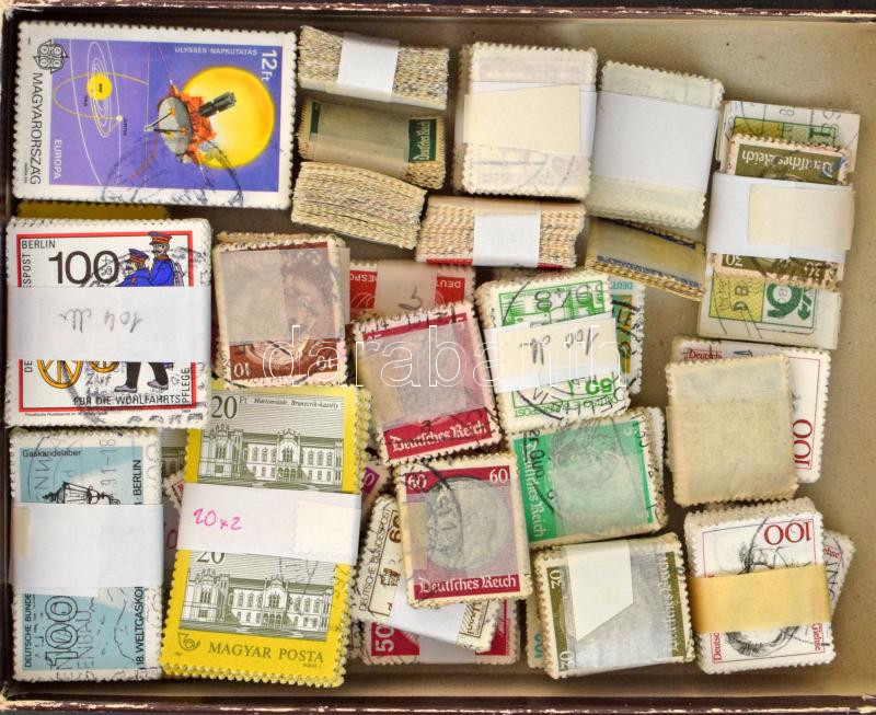 Vegyes bündli és töredék tétel kis dobozban, magyar és külföldi bélyegekből (Kastélyok, Reich stb)