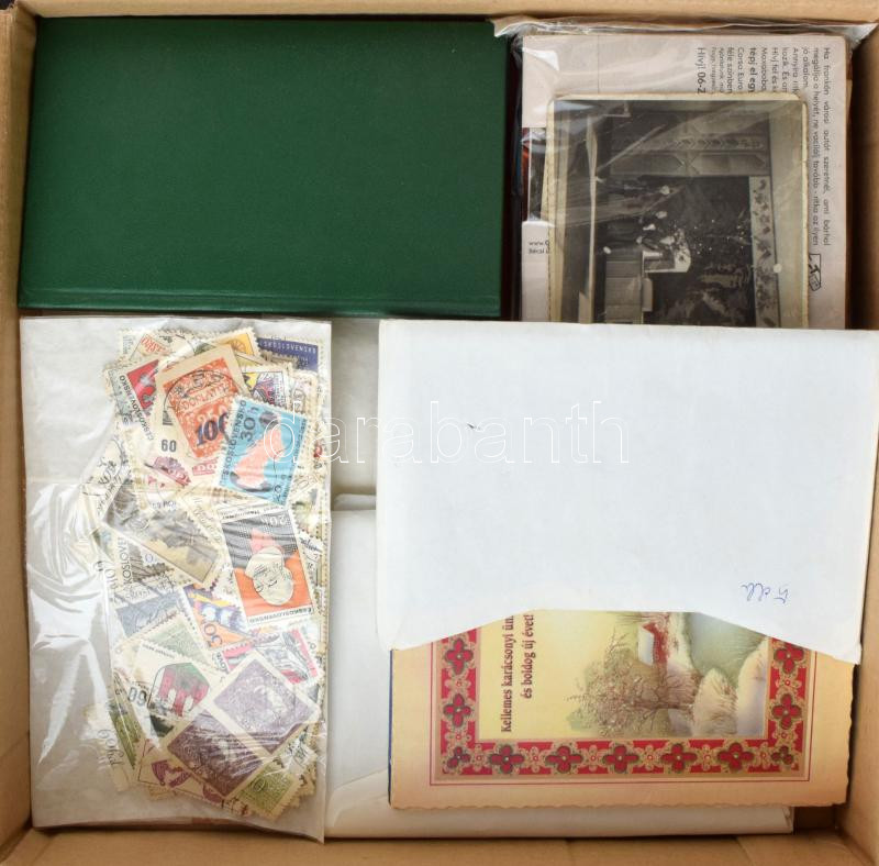Description: Vegyes tétel magyar és külföldi bélyegekkel, küldeményekkel, néhány blokkal, kis berakókkal, 2 közepes dobozba rendezve, az egész egy nagyobb kartondobozban