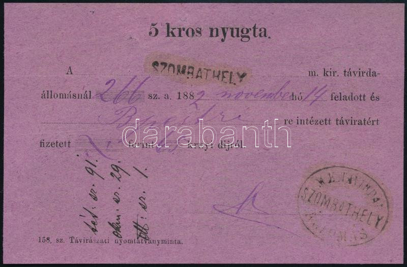 1882 Rendkívül ritka, lila színű 5kr-os nyugta "M.K. TÁVIRDA ÁLLOMÁS /SZOMBATHELY" ellipszis alakú + "SZOMBATHELY" egysoros bélyegzéssel