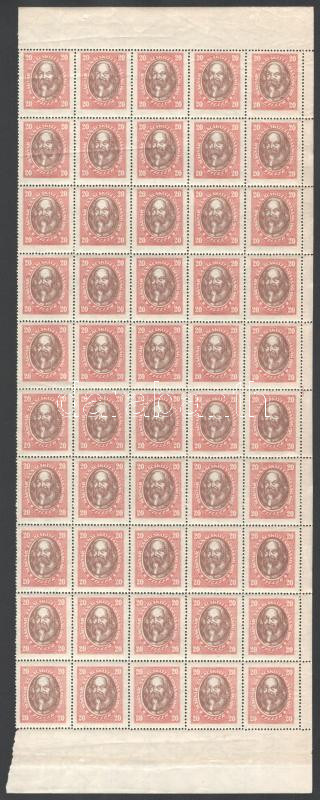 1919 Magyar Tanácsköztársasági arcképek 20f 50-es ívdarab álló vízjell...