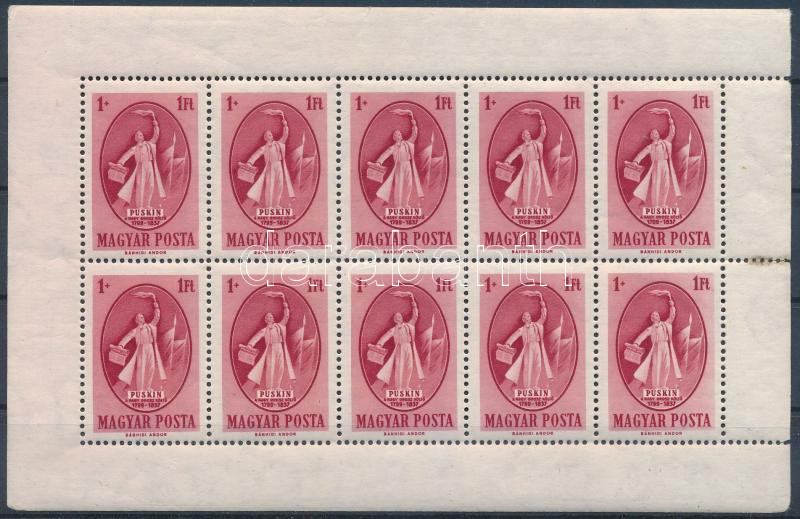 1949 Puskin tízes ív bal oldalon fogazatlan, jobb oldalon fogelválások...