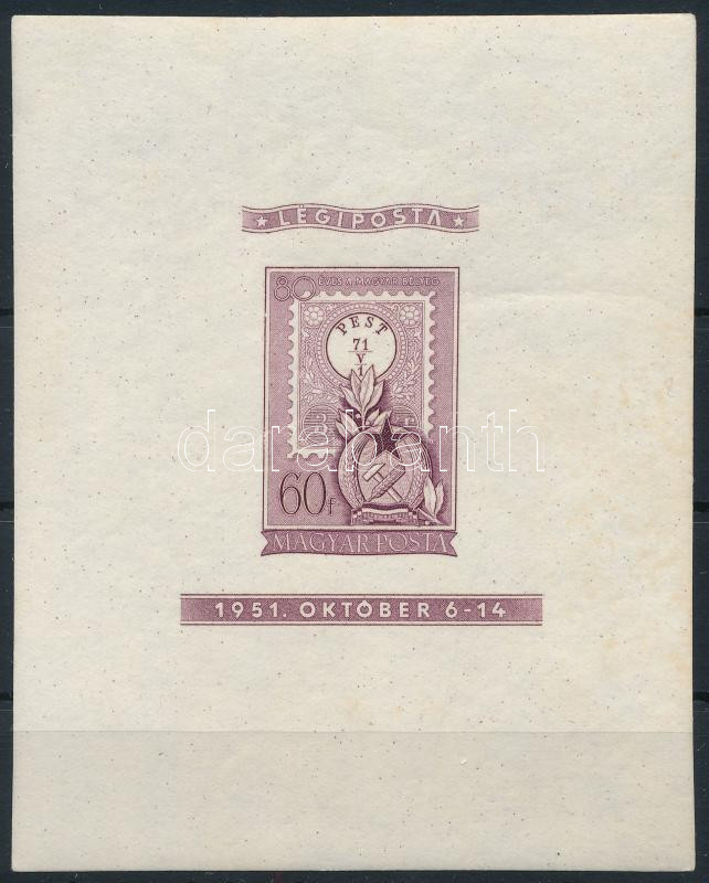 1951 80 éves a magyar bélyeg vágott lila blokk, jó minőség, enyhe ráncok (450.000)