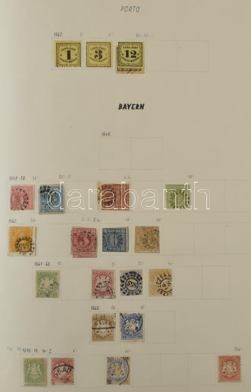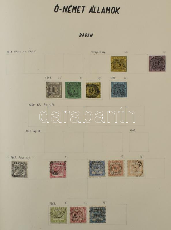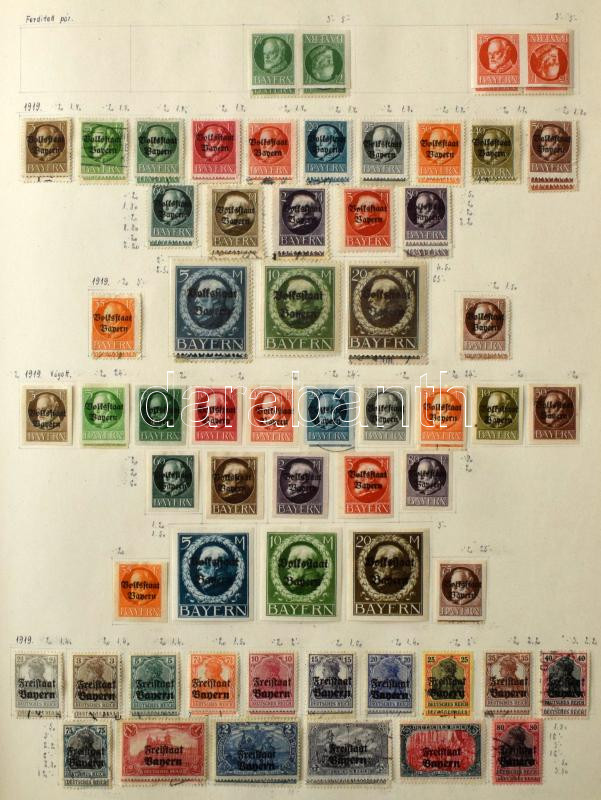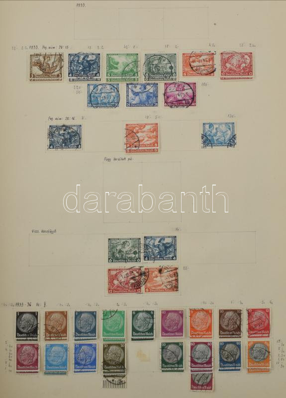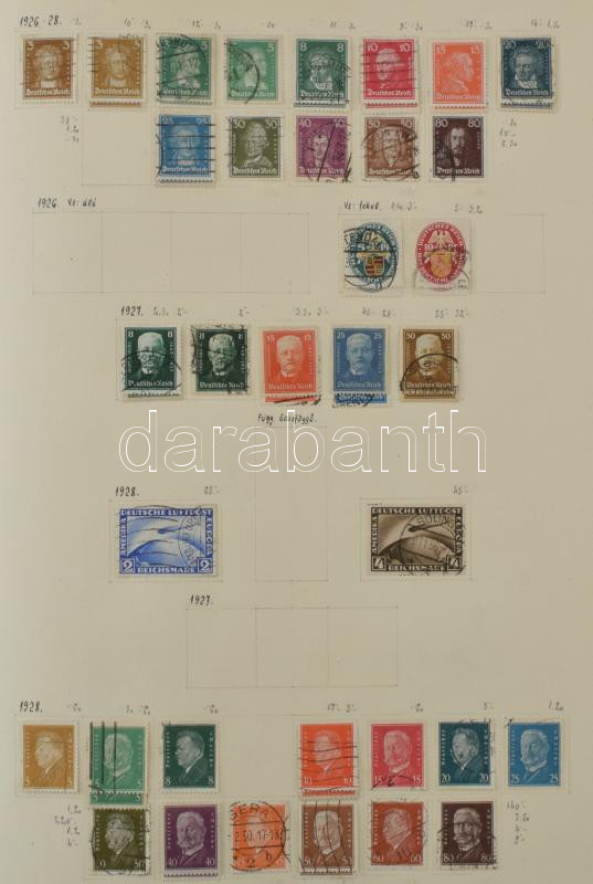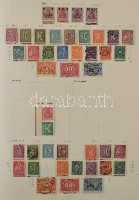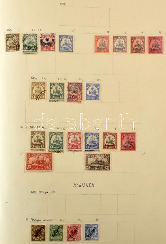 Németország 1945 előtt: német államok, Deutsches Reich, gyarmatok, külföldi posták, 1. és 2. világháborús megszállások, Feldpost, népszavazási területek, Danzig, Saar rendkívül tartalmas, elsősorban bélyegzetten gyűjtött gyűjtemény esetenként használatlan, postatiszta másodpéldányokkal. Jó minőségű bélyegekből összeállított, gondosan kezelt szép anyag, közel 6.000 bélyeg 3 db nagyméretű házilagos albumban, a használatlanok celofán csomagolásban. 2010 körüli értékelés szerint Mi EUR ~40.000.- Érdemes megnézni!!