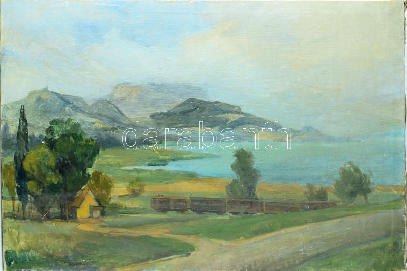 Jelzés nélkül, feltehetően XX. közepe: Balaton, háttérben a Badacsony. Olaj, vászon, jelzett, 60×90 cm