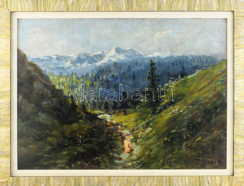 Olvashatatlan jelzéssel: Hegyvidéki táj. Olaj, karton. Fakeretben. 44,...