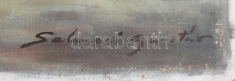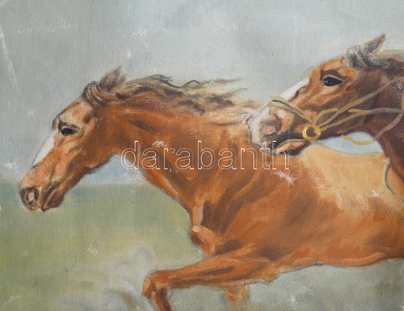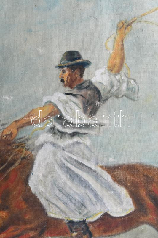 Selmeci Gusztáv jelzéssel: Száguldó lovak csikóssal. Olaj, vászon, sér...