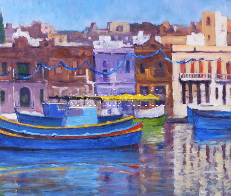 Somos jelzéssel: Kikötő hajókkal. Olaj, farost. 50×31,5 cm.