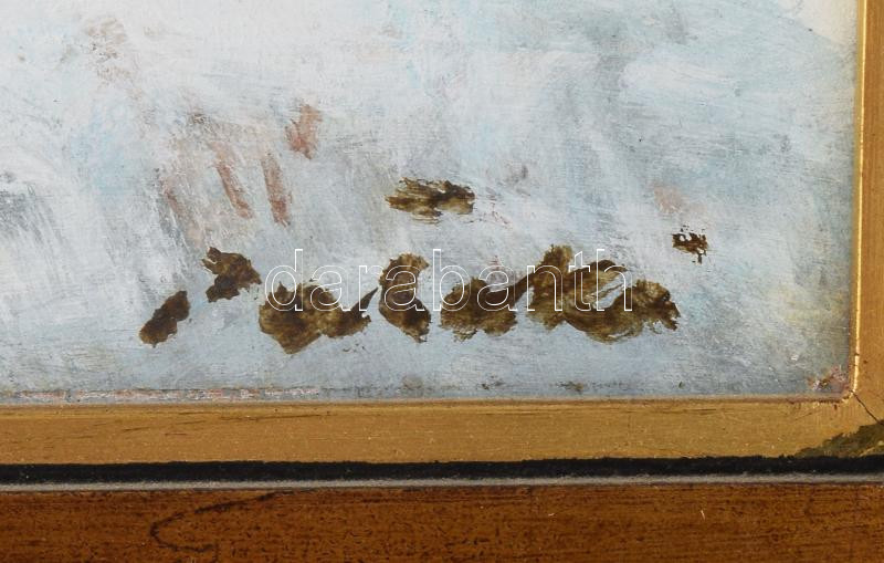 Pataki József (1928-1995): Téli táj. Olaj, farost. Jelzett. Hátoldalán a művész autográf aláírásával. Dekoratív fakeretben. 30,5x50 cm