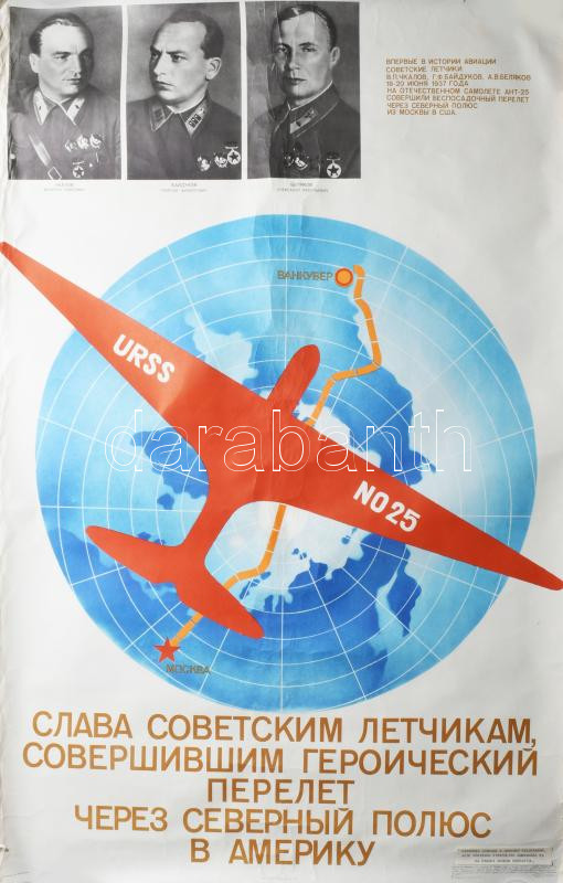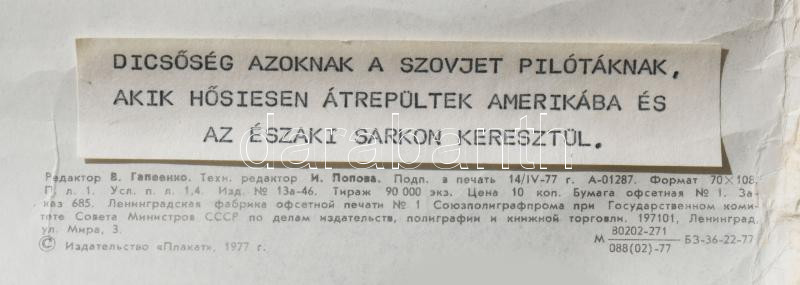 Description: 1953 Szovjet katonai repülős propaganda plakát ("Dicsőség azoknak a szovjet pilótáknak, akik hősiesen átrepültek Amerikába..."), apró lapszéli szakadásokkal és gyűrődésekkel, feltekerve, 103x66,5 cm