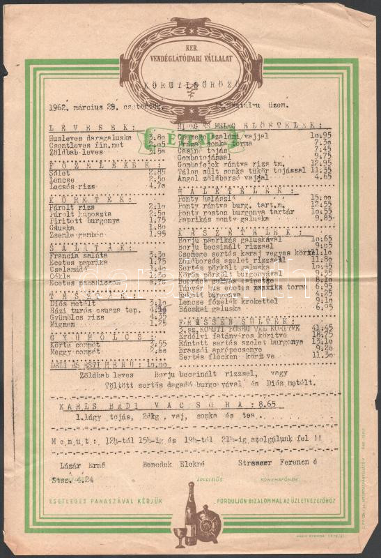 1961-1989 3 db régi étlap Körúti söröző, Hotel Palace stb