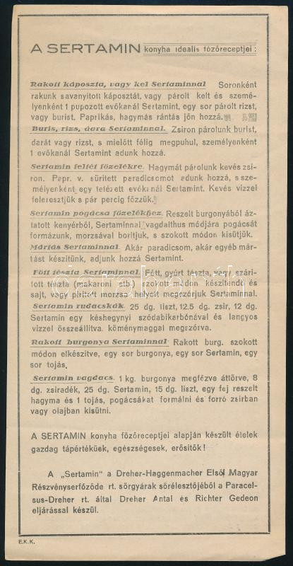 cca 1930 A Sertamin konyha ideális főzőreceptjei, Paracelsus R.T. vitamin- és gyógyszerkészítmények (Bp., X., Halom u. 42.), kétoldalas reklámlap