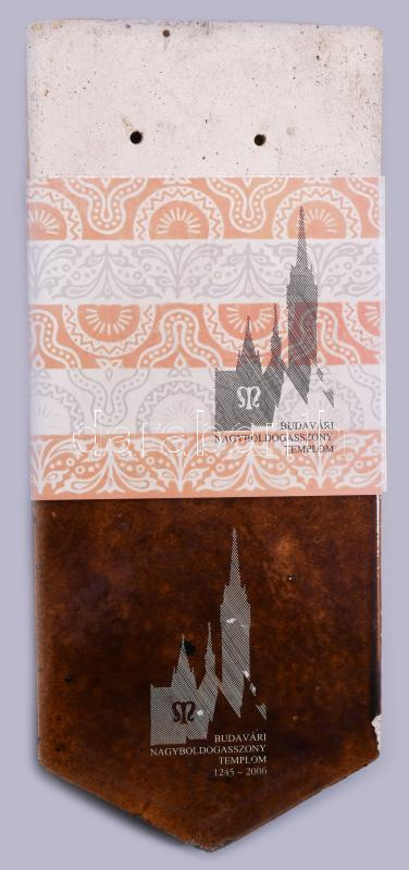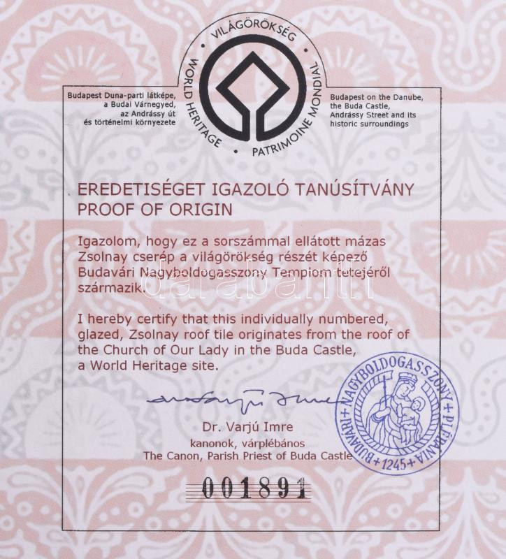 A világörökség részét képezÅ‘ budavári Nagyboldogasszony-templom (Mátyás-templom) tetejérÅ‘l származó, mázas Zsolnay cserép, dobozában, eredetiséget igazoló tanúsÃtvánnyal, sorszámmal, 34,5x14,5 cm / Glazed Zsolnay roof tile from the Church of the Assumption of the Buda Castle (Matthias Church) World Heritage site, in original box, with certificate, 34,5x14,5 cm