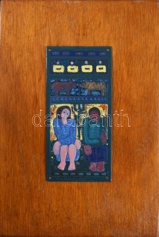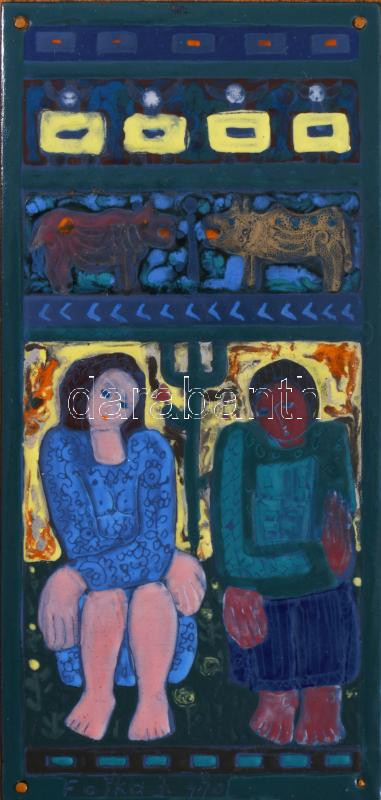 Fajka János (1935-): Két alak. Tűzzománc, fémlemez, jelzett, fa lapon,...