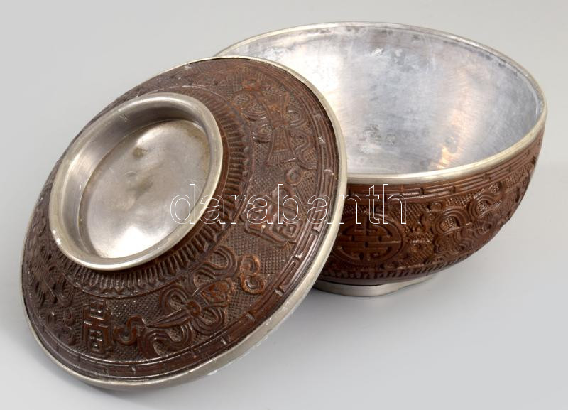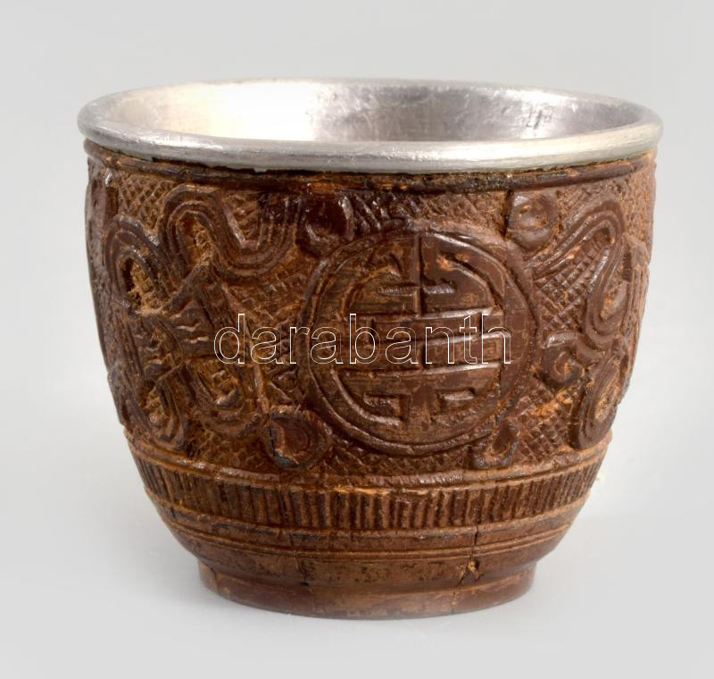 cca 20. sz. eleje, Kínai 14 részes asztali szett, váza, fedeles edény, 12 darab pohár. Faragott kókusz, ón, m: 15 cm alatt