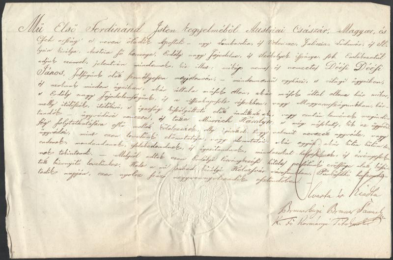 1848 Kolozsvár. Brunnbergi Brunner Sámuel főkormányi titoknok aláírásával ellátott ügyvédi meghatalmazó irat igazolása, császári pecséttel. déési Déési János.