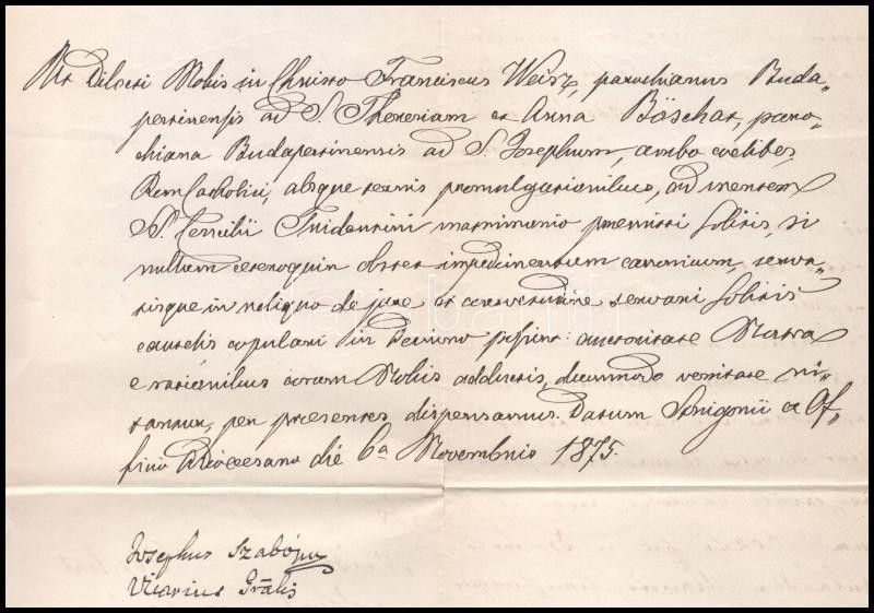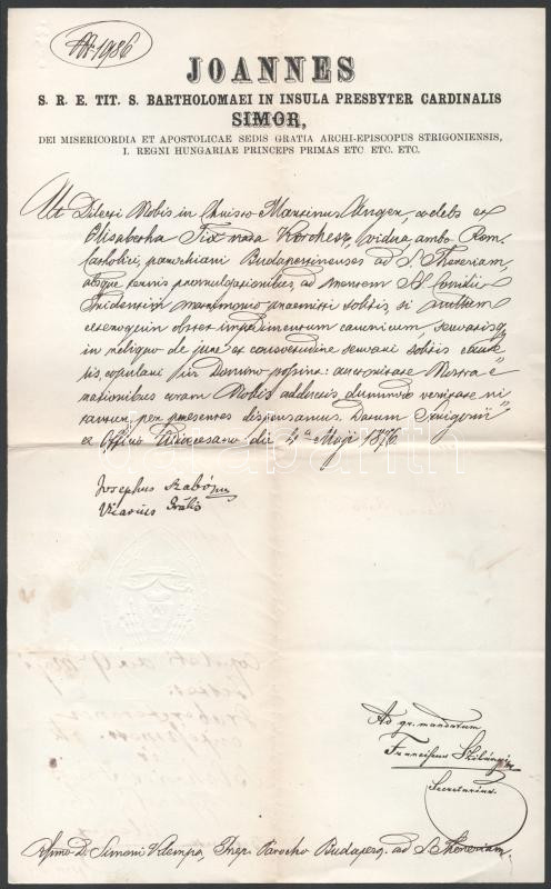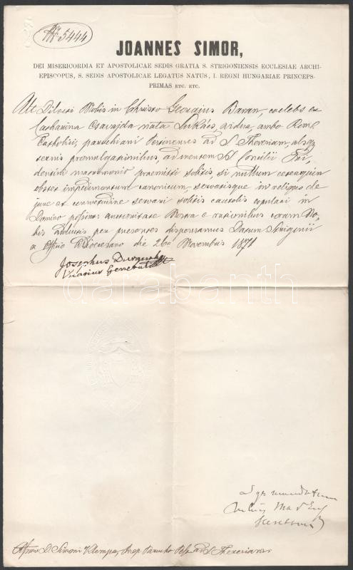 Description: 1870-1876 Simor József esztergomi érsek fejléces levélpapírján Durguth József (1790-1872), Márkus Gyula (1825-1893) püspök, Szabó József érseki titkár és Szilágyi Ferenc titkár aláírása