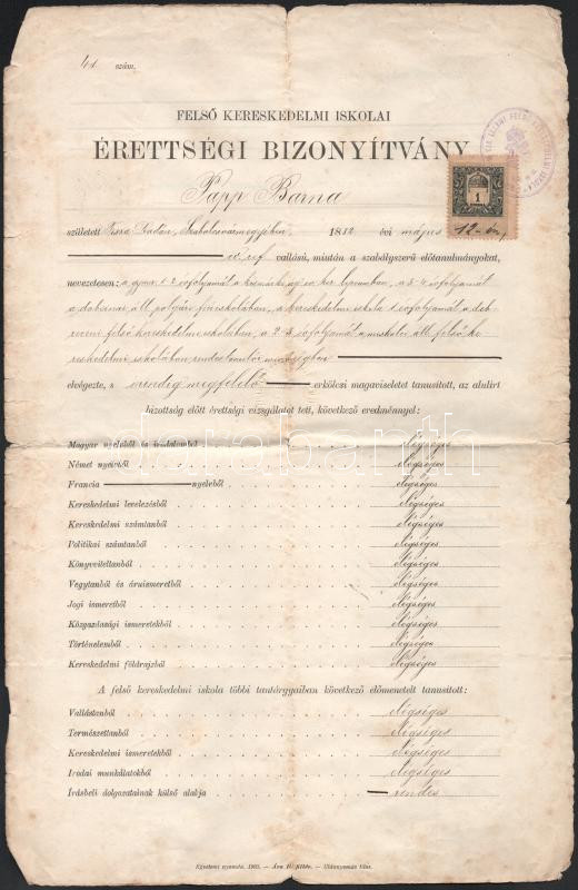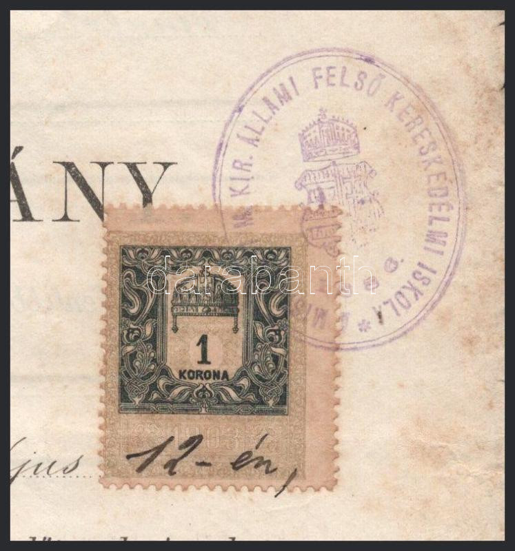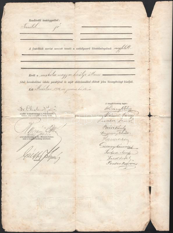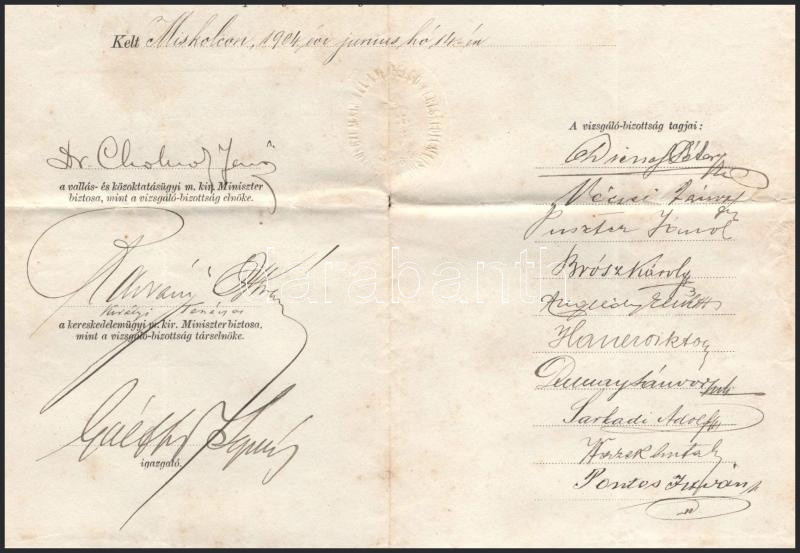 1904 Miskolc, felső kereskedelmi iskolai érettségi bizonyítvány Cholnoky Jenő (1870-1950) földrajztudós, Radvány István királyi tanácsos, Brósz Károly, Haner Viktor, Dunay Sándor, Sarkadi Adolf és mások aláírásával, 1K okmánybélyeggel, kissé foltos, sérülésekkel
