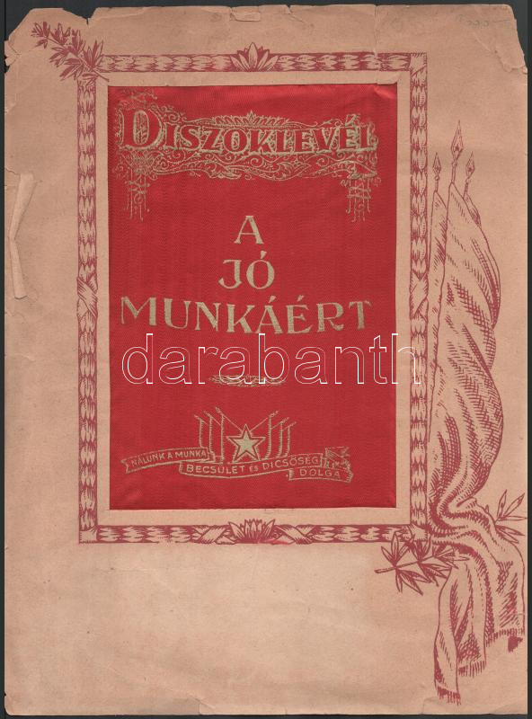 cca 1950 Selyem díszoklevél jó munkáért, sérült papír paszpartuban