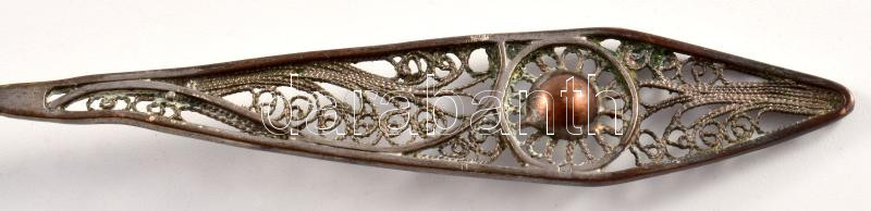 Antik ezüstözött rész kanál, kopással, filigrán díszítéssel, h: 14 cm