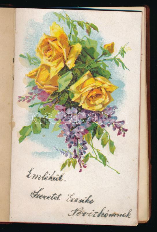 Description: 1918-1921 Bp.-Újpest, Erzsike nevű lány emlékkönyve, kb. 25 oldalnyi bejegyzéssel, rajzokkal, egy oldalon szárított virággal, kissé viseltes bársonykötésben