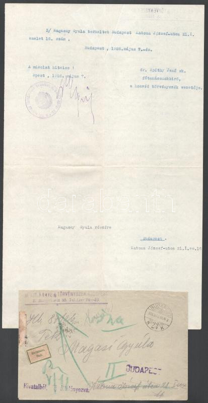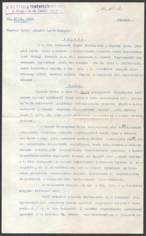 1926 Bp., a M. Kir. Honvéd Törvényszék végzésről értesítő levele Magas... https://www.darabanth.com/en/510-Online-auction/510.0/Art-and-other-collectibles/Military~814/1926-Bp-a-M-Kir-Honved-Torvenyszek-vegzesrol-ertesito-levele-Magassy-Gyula-reszere-~II3431290