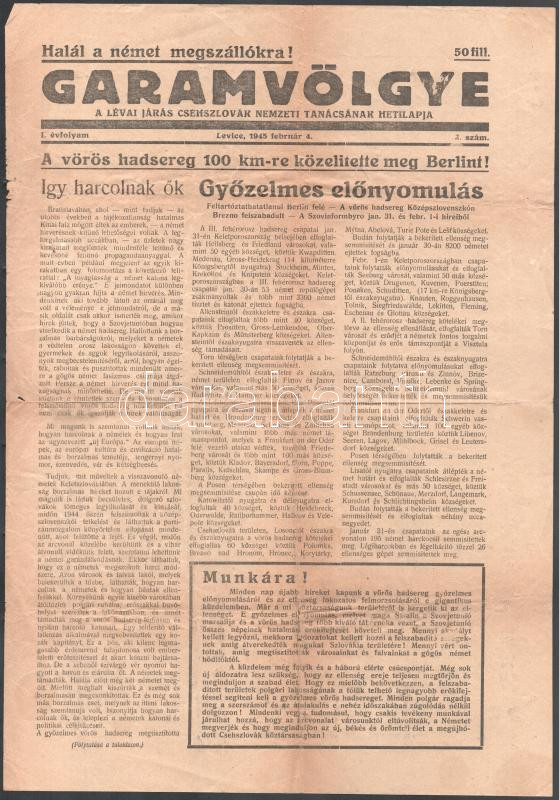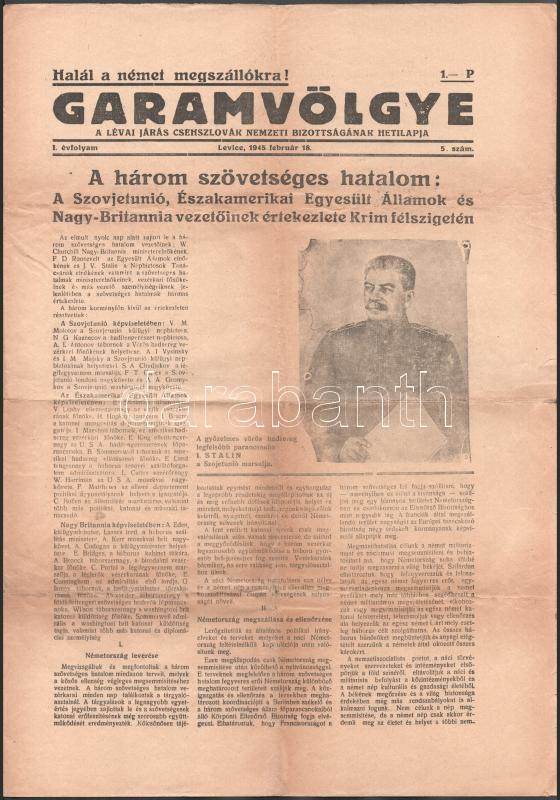 Description: 1945 Garamvölgye, a lévai járás csehszlovák nemzeti bizottságának hetilapja I. évf. 3. és 5. számai, 1945. febr. 4.-febr. 18., a szövetséges hatalmak mellett kiálló, németellenes tartalommal, kisebb sérülésekkel, 2 p., 4 p.