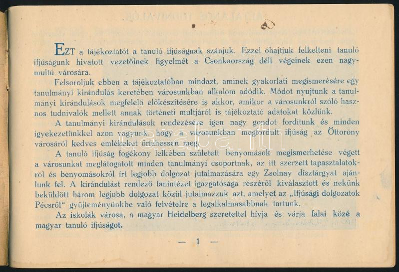 Pécs. Tájékoztató a város nevezetességeiről. Pécs, é.n. [1934], Idegenforgalmi Iroda, 32 p. Kiadói tűzött papírkötés. Számos képpel, rajzzal, térképpel, reklámokkal illusztrálva,