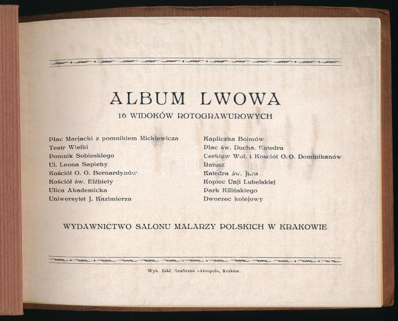 Description: cca 1930 Lwów (Lviv, Lemberg) városát bemutató album 16 db fekete-fehér képpel, Kraków, Salon Malarzy Polskich kiadása, kiadói zsinórfűzéses papírkötésben, megkímélt állapotban, 16x21 cm