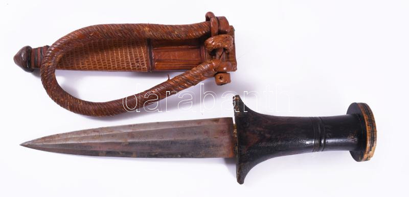 Szudáni népi tőr, fa markolattal, bőr tokban, h: 25 cm