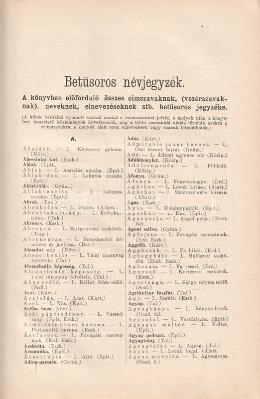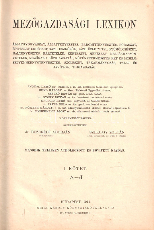 Mezőgazdasági lexikon. Angyal Dezső, Bund Károly, Cselkő István és mások közreműködésével szerkesztették Bezerédj Adorján és Szilassy Zoltán. I. kötet: A-J.