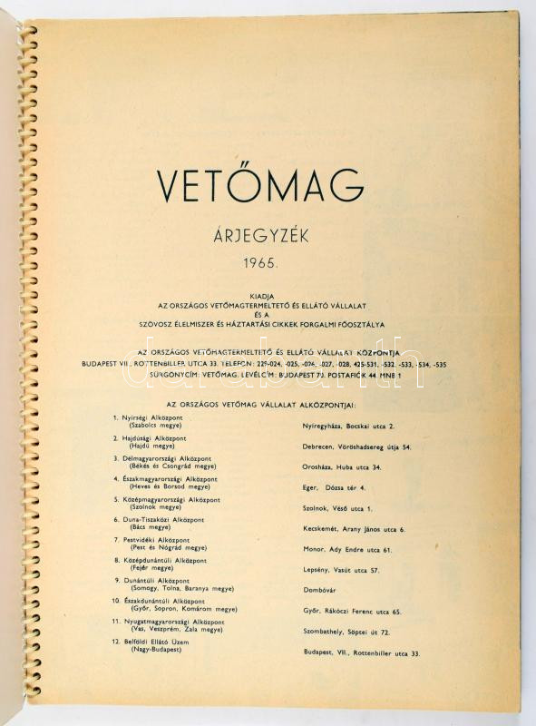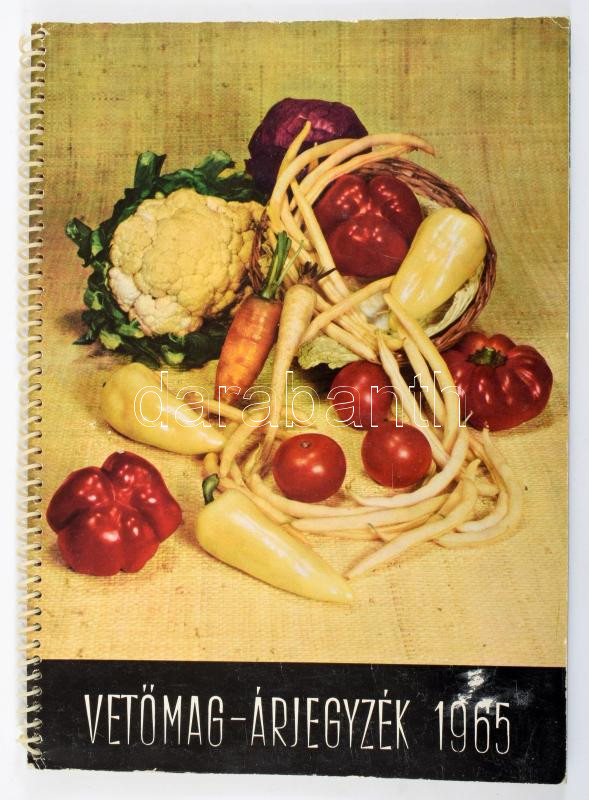 VetÅ‘mag árjegyzék 1965. Kiadja az Országos VetÅ‘magtermeltetÅ‘ és Ellátó Vállalat és a SZÖVOSZ Élelmiszer és Háztartási Cikkek Forgalmi FÅ‘osztálya. Bp., 1965, Athenaeum-ny. Fekete-fehér és szÃnes képekkel illusztrálva. Kiadói spirálfűzéses papÃrkötés.