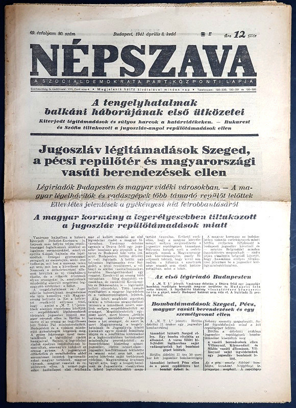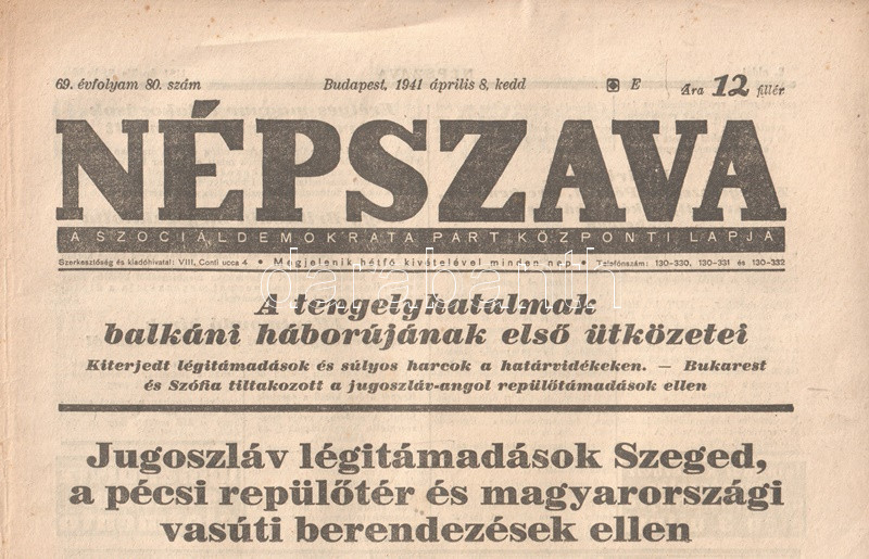 [Folyóirat] Népszava. A Szociáldemokrata Párt központi lapja. Főszerkesztő: Szakasits Árpád. 69. évfolyam, 80. szám. (1941. április 8.) [A tengelyhatalmak balkáni háborújának első ütközetei. Nagy-Britannia megszakítja diplomáciai kapcsolatait Magyarországgal.]