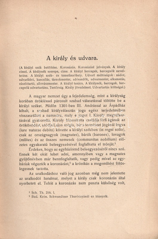 Gregorich Izidor tanulmánya a Nagy Lajos életét megőrző latin krónikákból von le emlékezetes társadalomtörténeti és művelődéstörténeti következtetéseket. A szerző a krónikaszöveg nyomán a királyi udvar részletes rajzát adja, vázolja az udvari méltóságok jogköreit, az udvartartás költségeit, a koronázás menetét, az egyházi és a nemesi rend jellemrajzát, majd a törvénykezés, az erkölcsi élet és a szellemi művelődés részleteit közli. Kuriózum gyanánt az egyik Lajos-krónikába beékelt magyar nyelvű szövegemléket is leírja, valamint az első fennmaradt magyar szitkozódás szövegét is - betűhíven.
