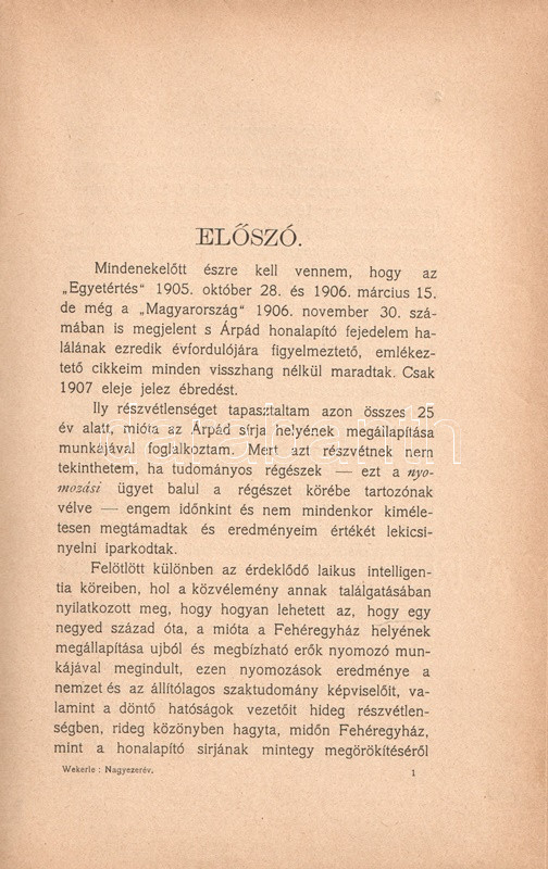 Wekerle László (1840-1918) ügyvéd, máramarosi tanfelügyelő, műkedvelő történész szenvedélyes nyelven megfogalmazott, hosszú tanulmányában összefoglalja Árpád fejedelem sírja pontos hollétének meghatározásával kapcsolatos, 25 éves kutatásait, cáfolja az ellenérveket, és kárhoztatja a téma iránti sajtóérdeklődés lanyha mivoltát. Wekerle tanfelügyelő Anonymus munkájából indul ki, és a fejedelmi sír hollétét húsz évvel korábbi megállapításaival összehangzóan Óbudán jelöli ki, az egykori Fehéregyháza területén (mely a modern korra már elpusztult).