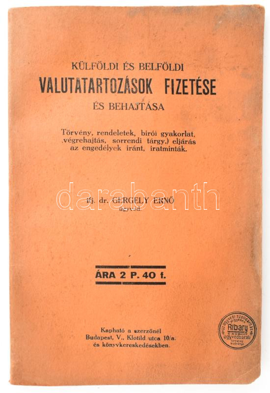 Gergely Jenő: Külföldi és belföldi valutatartozások fizetése és behajtása. Törvény, rendeletek, birói gyakorlat, végrehajtás, sorrendi tárgy. eljárás az engedélyek iránt, iratminták. Bp.,én., Szerzői,(Centrum-ny.), 116 p. Kiadói foltos papírkötés.