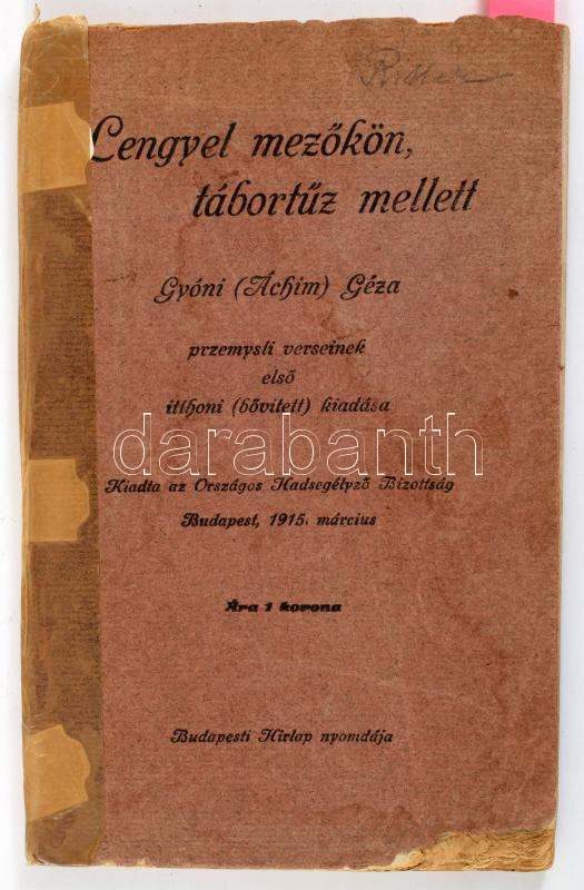 Gyóni (Áchim) Géza: Lengyel mezőkön, tábortűz mellett. Nyomtatott dedikációval. Bp., 1915, Országos Hadsegélyező Bizottság. Kiadói sérült papírkötés, sérült lapok, ragasztott gerinc, viseltes állapotban.