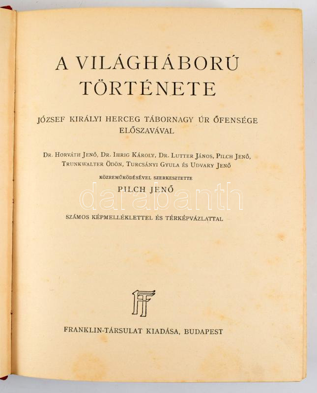 Pilch JenÅ‘ (szerk.): A világháború története. József királyi herceg tábornagy úr Å‘fensége elÅ‘szavával. Bp., é.n. [1928], Franklin. Kiadói dÃszes, dúsan aranyozott egészvászon-kötésben, kopott borÃtó, térképmellékletekkel. Néhány lapon enyhe foxing, kötés szép állapotban