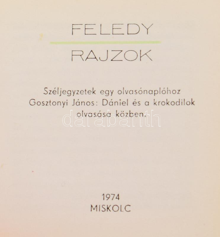 Feledy: Rajzok Széljegyzetek egy olvasónaplóhoz Gosztonyi János: Dániel és a krokodilok olvasása közben. Miskolc, 1974. Minikönyv. Kiadói műbőr kötés, megjelent 500 példányban.