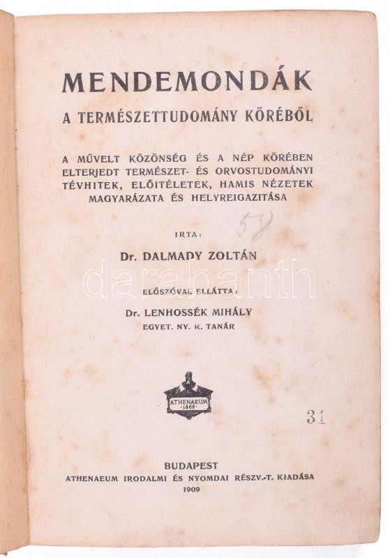 Dr. Dalmady Zoltán: Mendemondák a természettudomány köréből. Előszóval elláta: Lenhossék Mihály. Bp., 1909, Athenaeum Irodalmi és Nyomdai Rt. 390p. Kiadói kissé kopottas egészvászon kötés.