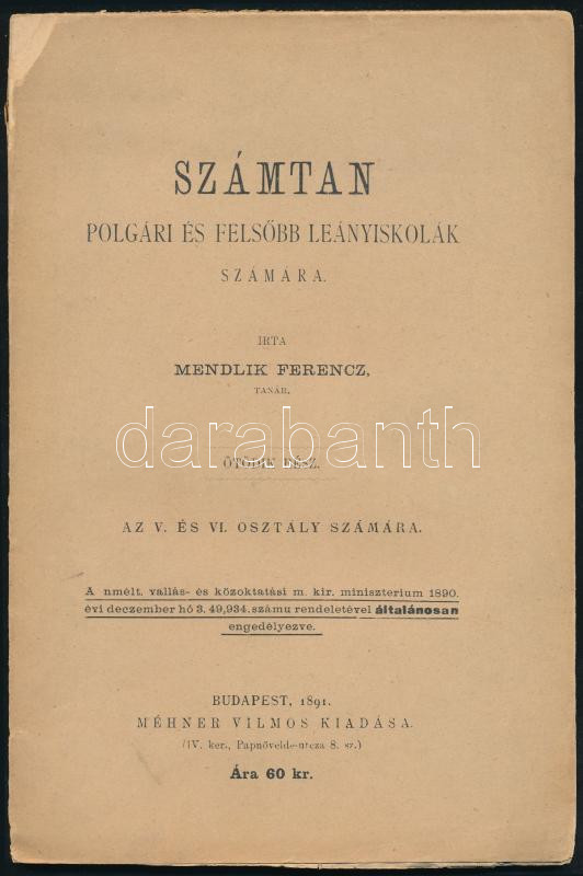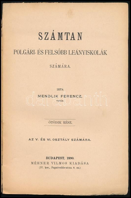 Mendlik Ferenc: Számtan polgári- és felsőbb leányiskolák számára. Ötöd... https://www.darabanth.com/en/510-Online-auction/510.0/Books/Books-Natural-sciences-Medicine~774/Mendlik-Ferenc-Szamtan-polgari-es-felsobb-leanyiskolak-szamara-Otodik-resz-Az-V-es-~II3446456