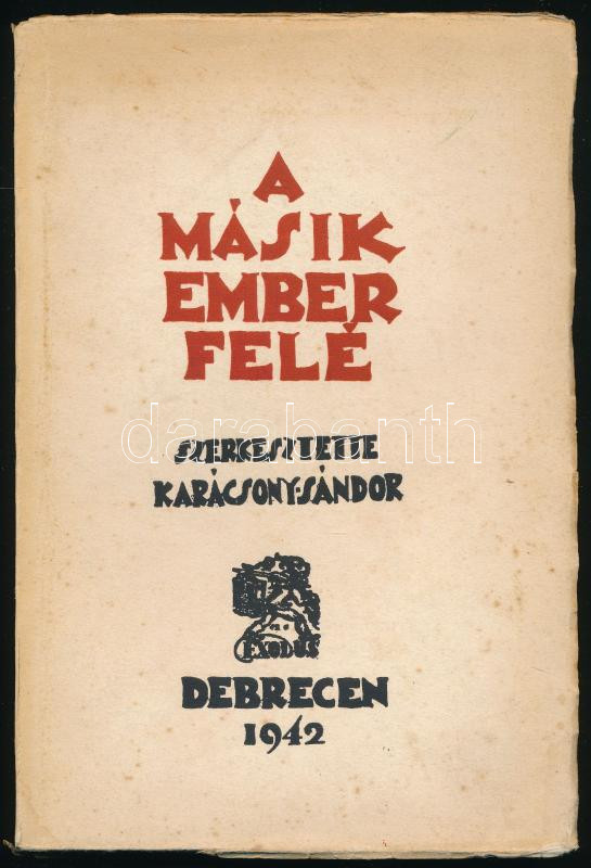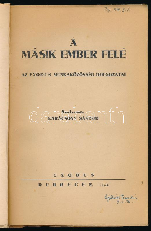 Karácsony Sándor (szerk.): A másik ember felé. Az Exodus munkaközösség... https://www.darabanth.com/en/510-Online-auction/510.0/Books/Books-Other-rarities~785/Karacsony-Sandor-szerk-A-masik-ember-fele-Az-Exodus-munkakozosseg-dolgozatai-Debrecen-~II3445323