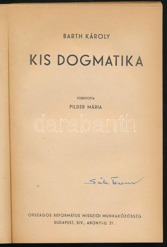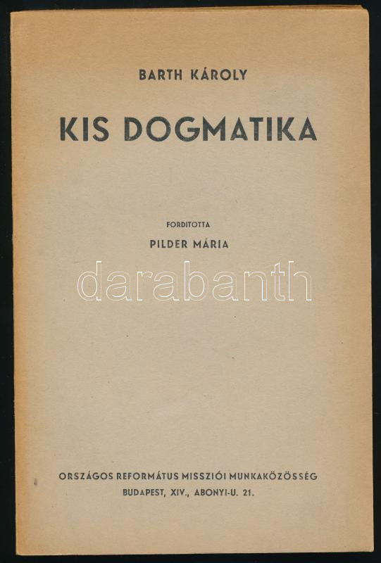 Barth, [Karl] Károly: Kis dogmatika. Ford.: Pilder Mária. Bp., [1948],... https://www.darabanth.com/en/510-Online-auction/510.0/Books/Books-Religion~780/Barth-Karl-Karoly-Kis-dogmatika-Ford-Pilder-Maria-Bp-1948-Orszagos-Reformatus-Missz~II3428984