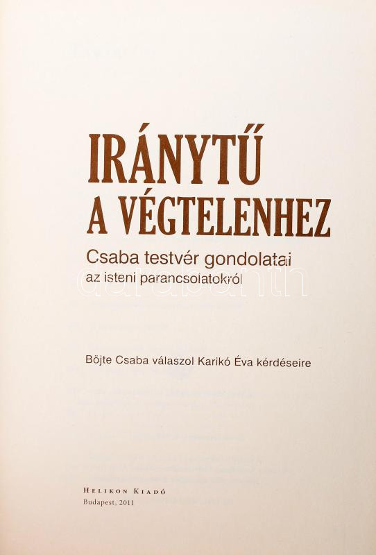 Karikó Éva - Böjte Csaba: Iránytű a végtelenhez. Csaba testvér gondola... https://www.darabanth.com/en/510-Online-auction/510.0/Books/Books-Religion~780/Kariko-Eva-Bojte-Csaba-Iranytu-a-vegtelenhez-Csaba-testver-gondolatai-az-isteni-parancsol~II3412290