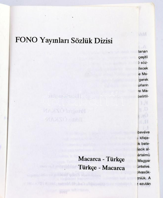 Description: Ertugrul Özkan - Ildiko Özkan: Macarca cep sözlügü. Magyar zsebszótár. Macarca-Türkce, Türkce-Macarca. 1994, Fono Sözlük Dizisi. Török és magyar nyelven. Kiadói nyl-kötés, kissé foltos borítóval.