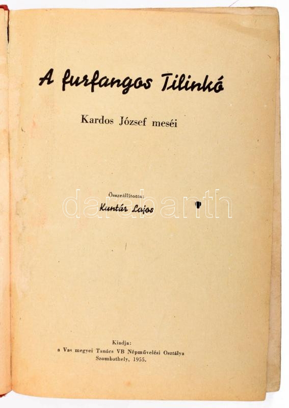 Kuntár Lajos: A furfangos Tilinkó. Kardos József meséi. Vasi Népmesék ... https://www.darabanth.com/en/510-Online-auction/510.0/Books/Books-Tales~783/Kuntar-Lajos-A-furfangos-Tilinko-Kardos-Jozsef-mesei-Vasi-Nepmesek-I-Szombathely-1955-Va~II3432631