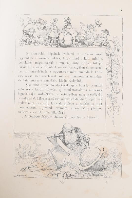 Az Osztrák-Magyar Monarchia írásban és képben. Bevezető köt. (I. kötet.) Bp., 1887, M. Kir. Államnyomda, VIII+594+1 p. Nagyon gazdag egészoldalas és szövegközti képanyaggal illusztrált. Kiadói dúsan aranyozott, festett egészvászon-kötés, Gottermayer-kötés, márványozott lapélekkel, enyhe foxinggal, gerincen kis sérüléssel.