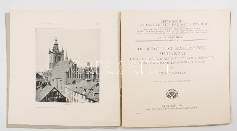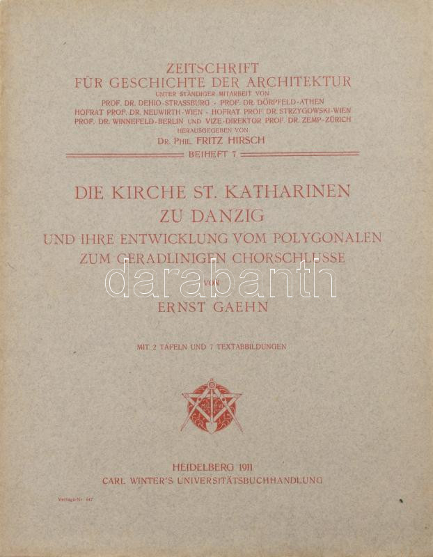 Ernst Gaehn: Die Kirche St. Katharinen zu Danzig und ihre Entwicklung vom polygonalen zum geradlinigen Chorschlusse. Zeitschrift Für Geschichte Der Architektur Beiheft 7. Heidelberg, 1911, Carl Winter's Universitätsbuchhandlung, 7+242-282 [48] p. + 2 t. Német nyelven. Kiadói papírkötés, a borító ketté szakadt, az I. tábla kijár. Felvágatlan példány.