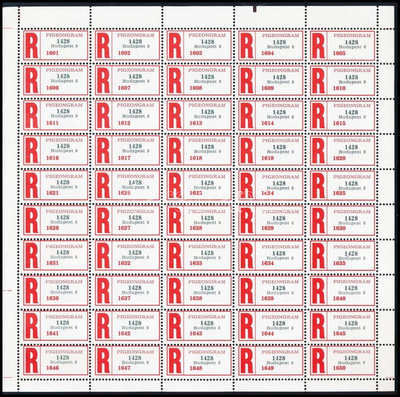 A galambposta járathoz készült speciális Pigeongram ajánlási ragjegy teljes ívben