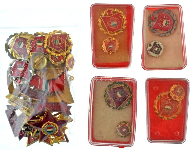 DN(~1970-1980) "Kiváló Dolgozó" aranyozott bronz kitüntetés miniatűrrel (4x) + DN(~1975-1980) "Szocialista Brigád" arany-, ezüst- és babérkoszorús kitüntető jelvények miniatűrrel (3xklf,12db, ebből 4x műanyag tokban) + DN(~1975-1980) "A Vállalat Kiváló Brigádja - Szocialista Brigád" babérkoszorús kitüntető jelvény + 1978. "Kiváló Munkáért" aranyozott, rátétes, műgyantás kitüntetés mellszalagon T:AU-VF