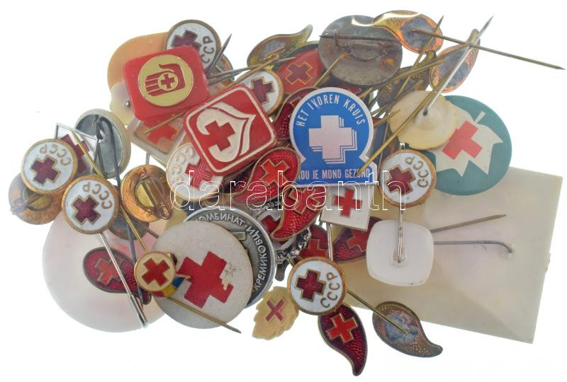 Vegyes, 53db-os külföldi Vöröskereszt / véradás tematikájú jelvény / kitűző tétel, ebből 15db fém Vöröskeresztes + 15db műanyag Vöröskeresztes + véradó jelvény (23x) T:AU-VF
